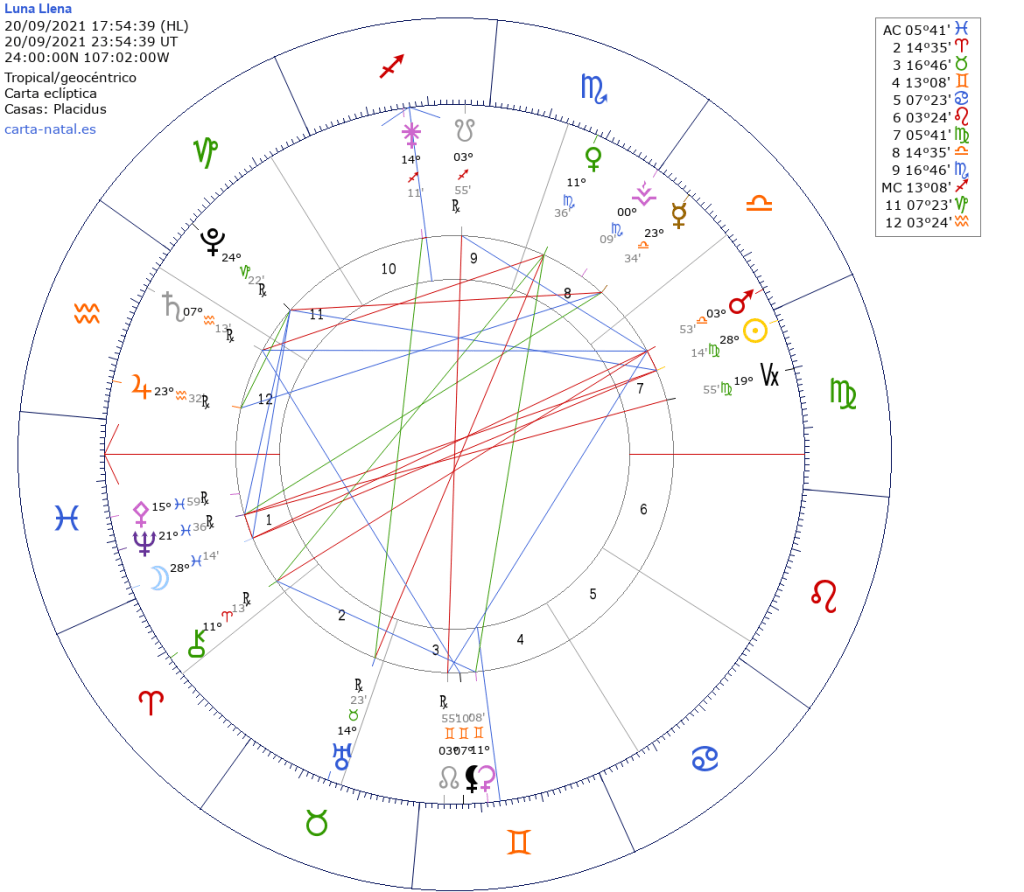 Sol trino Plutón retrógrado en Capricornio y Marte trino Saturno también retrógrado en Acuario. Enfrentamos e iluminamos el asunto emocional que representa la Luna Llena en Piscis, empoderándonos como consecuencia de una inevitable y fuerte transformación interna (Plutón en Capricornio); al mismo tiempo, actuamos tomando en cuenta las nuevas reglas que tratamos de construir (Saturno en Acuario), revolucionando lo que consideramos orden y adultez. De esta manera seguimos adecuándonos a la modernidad, y a los cambios en lo que antes era simple naturaleza y creación de recursos materiales y económicos, y que ha sido un proceso constante durante este 2021 (Saturno cuadratura Urano Rx en Tauro).