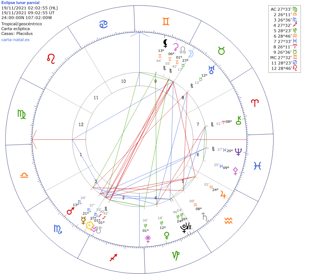Será el 19 de noviembre a las 3:02 hrs. tiempo del centro de México. Como es de Luna Llena, el Sol estará en Escorpio y la Luna en Tauro, ambos en el grado 27º.