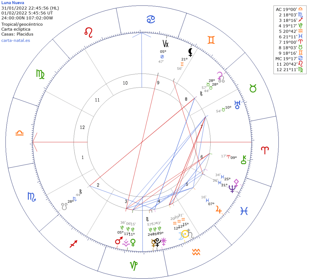 Será el 31.01 a las 23:46 hrs. tiempo del centro de México. Sol y Luna estarán en el grado 12º de Acuario y Saturno en el grado 15º.
