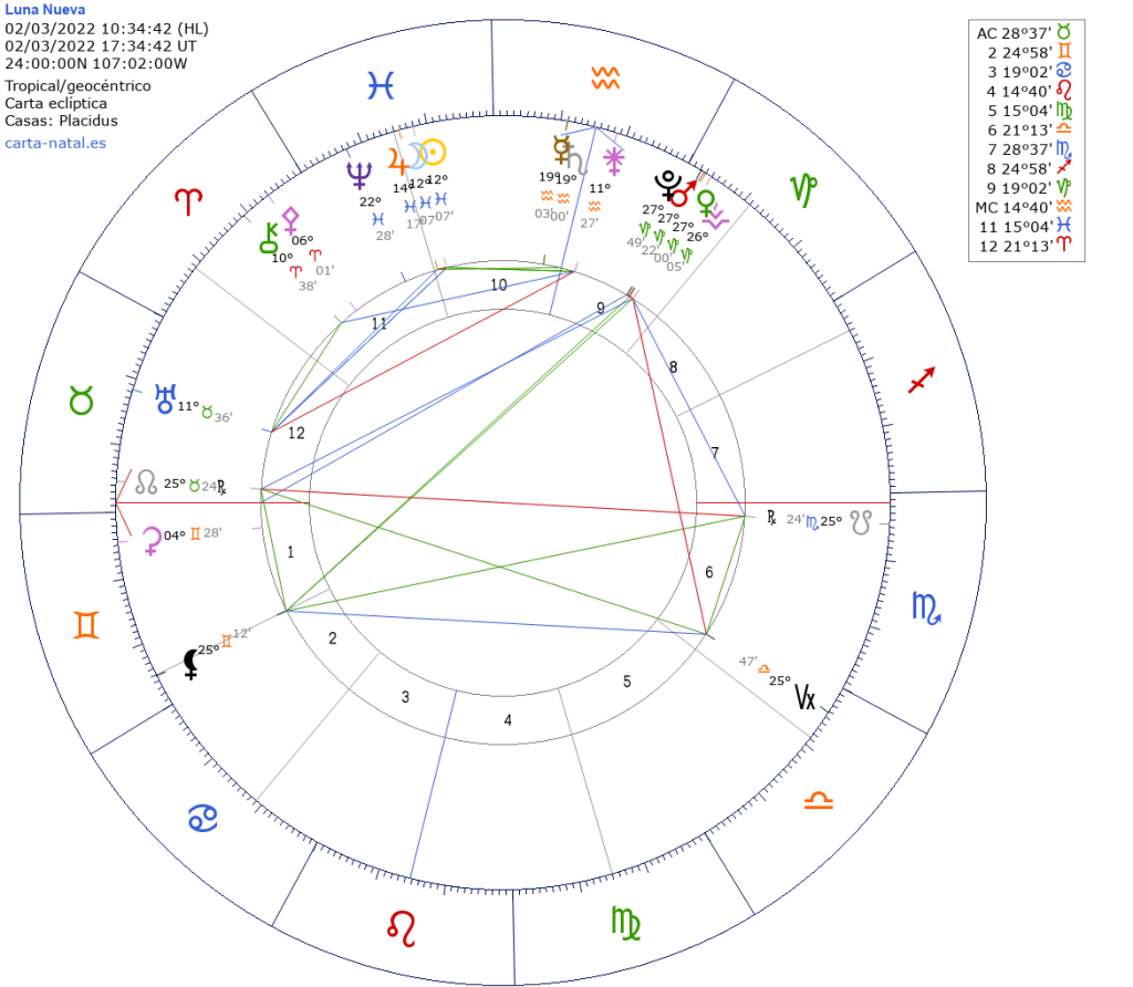 Será el 2 de marzo a las 11:34 hrs. tiempo del centro de México. En el grado 12 y en conjunción a Júpiter, que ya estará a 8º de perfeccionar conjunción a Neptuno para el 12 de abril.