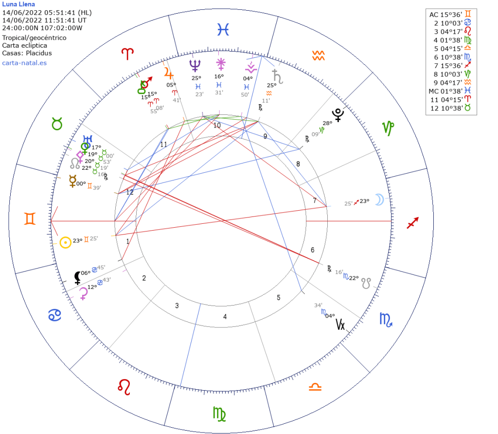 Será el 14 de junio a las 6:51 hrs. tiempo del centro de México. Sol en Géminis y Luna en Sagitario en 23º25′, representando el clímax de un proceso que comenzó a principios de diciembre 2021, con el eclipse total de Sol en Sagitario del 04.12.