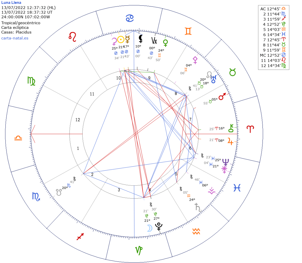 Aquí dejo la carta astral de esta Luna Llena en Capricornio y algunas claves muy breves para ubicar en qué casa nos sucede esta manifestación. Atentos que ya comenzamos con la triple conjunción Marte, Urano y nodo norte en Tauro.
