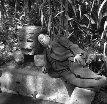 En este punto se me vino a la mente la fotografía de Diego Rivera junto a una fuente en el patio de la Casa Azul de Frida Kahlo. La descripción asegura que Diego estaba durmiendo. Lo que pensé yo cuando vi la foto, leí el texto y después vi en vivo y en directo el lugar donde sucedió, fue que Diego estaba bien borracho y después cayó rendido en el sitio. No sé, quizá sí lo haya encontrado cómodo, y yo esté exagerando con tanto prejuicio y teoría, pero a final de cuentas, y por tanto legado que nos dejó Rivera, podría ser injusto pensar mal de él, en una circunstancia tan casual como aquella, en su propia casa, con ropa tan cómoda como ese traje que trae puesto y la presencia de alguien con voluntad de tomar una cámara algo más compleja que las de ahora y hacerle una foto.