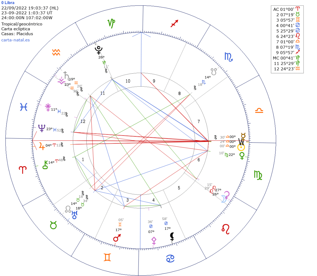 Venus y Marte en cuadratura. Saturno y Urano en cuadratura. Y Urano en nodo norte, apoyado de Venus, regente de Libra; Sol en Libra.