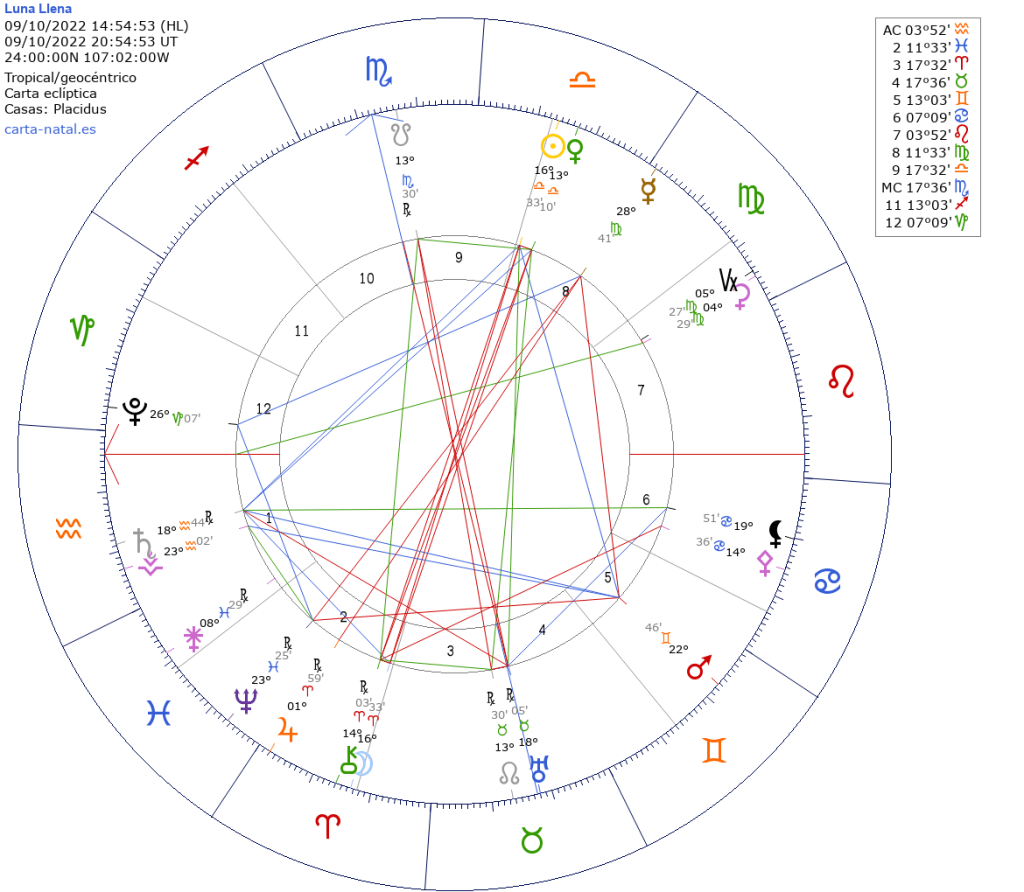 Será el 9 de octubre a las 15:54 hrs. tiempo del centro de México. Sol en Libra y Luna en Aries, ambos en grado 16. Representa el clímax de un ciclo que comenzó cerca del 01 de abril, con su Luna Nueva en Aries 2022.