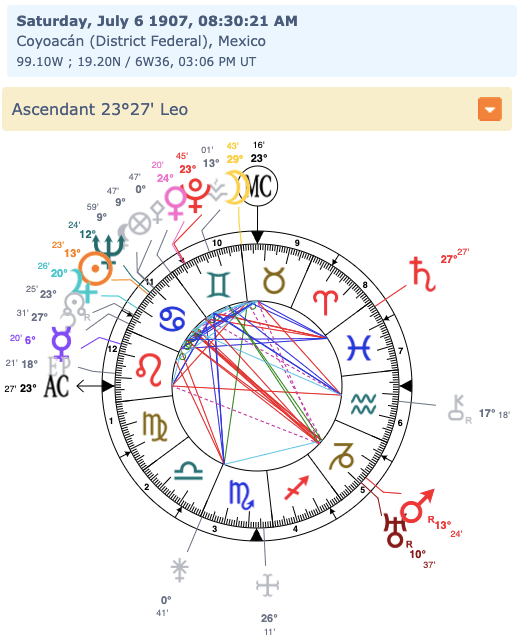 Estoy leyendo una biografía de Frida Kahlo y no puedo creer la facilidad que tenía para somatizar sus emociones. Así que revisé su carta natal por pura curiosidad y comparto aquí algunos detalles que me llamaron la atención.