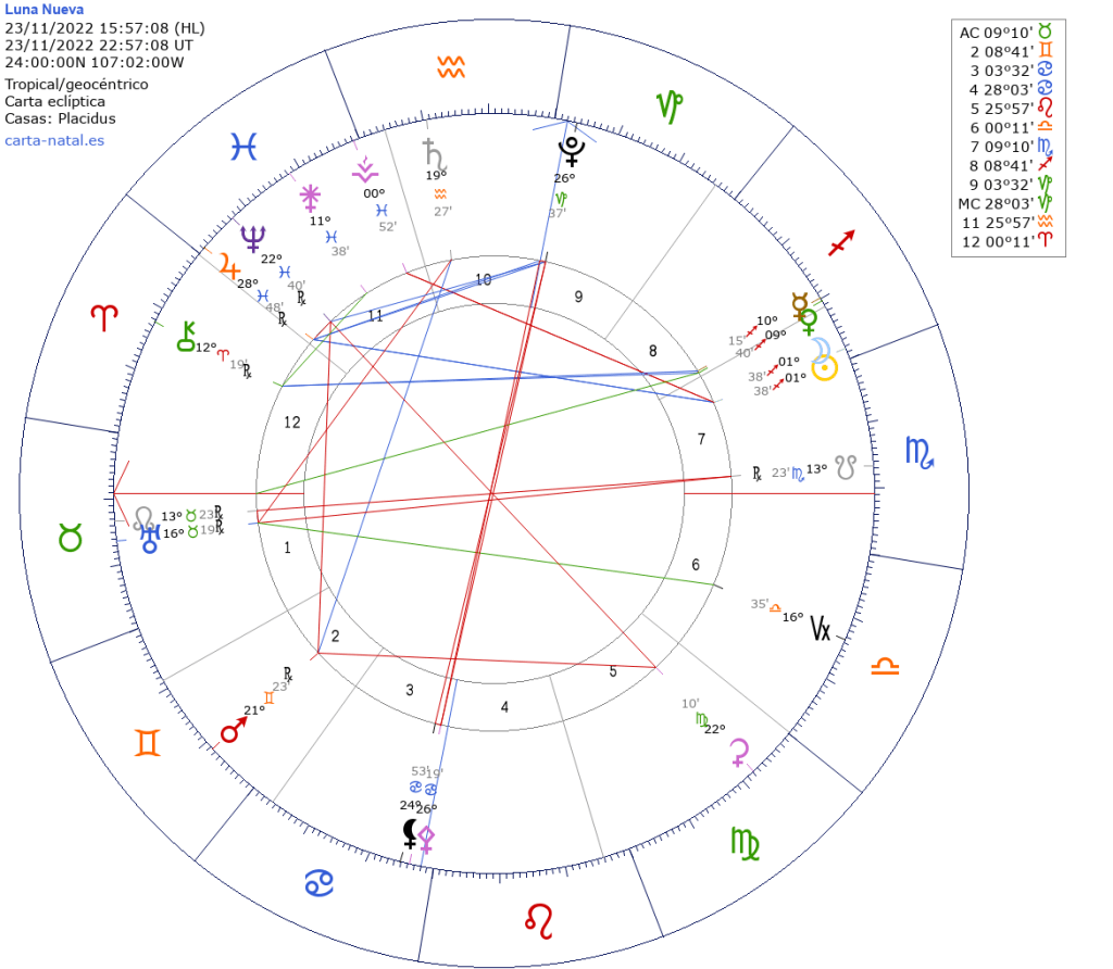 Será el 23 de noviembre a las 16:57 hrs. tiempo del centro de México. Ya con un Sol en Sagitario y una Luna en conjunción en el grado 01º38′.