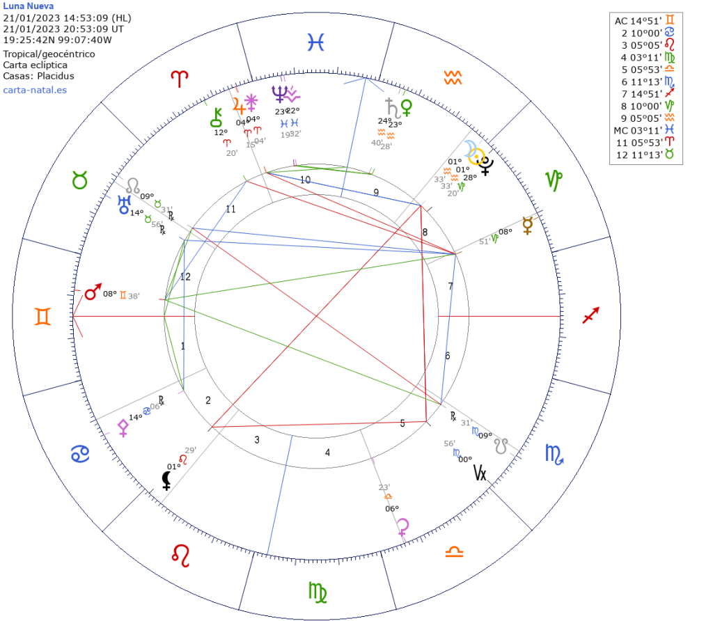 La razón de ser de esta Luna Nueva va más allá de lo que podemos ver en este momento, es decir, tiene que ver con la forma en que apostamos a un futuro con mejor calidad de vida pero al mismo tiempo, podríamos no ver a dónde exactamente nos está llevando, aún hay un gran factor incierto que pide abrirnos al cambio y confiar en que hacerlo nos liberará (Urano R -regente de Acuario- conjunción nodo norte en Tauro; Urano terminará retrogradación un día después 22.01, esto intensifica la sensación uraniana de cambio, liberación o incertidumbre para esta Luna Nueva).