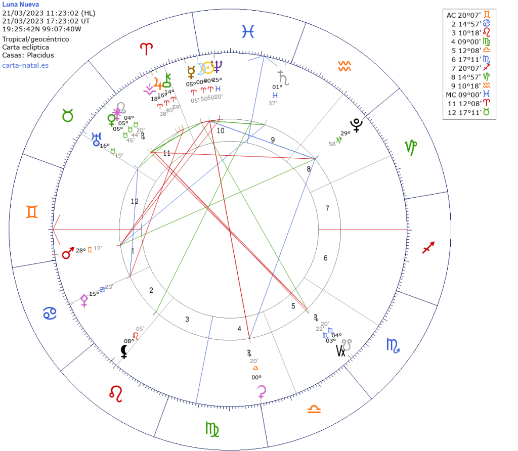 Será el 21 de marzo a las 11:23 hrs. tiempo del centro de México. Sol y Luna en 00º50′ de Aries. Corresponde a la primera Luna Nueva del año astrológico y también a la primera Luna Nueva en Aries del mes, porque para el 19 de abril se marcará una segunda en 29º que será también eclipse de Sol en Aries, el primero de la serie de eclipses Aries-Libra pero con los nodos todavía en Tauro y Escorpio.