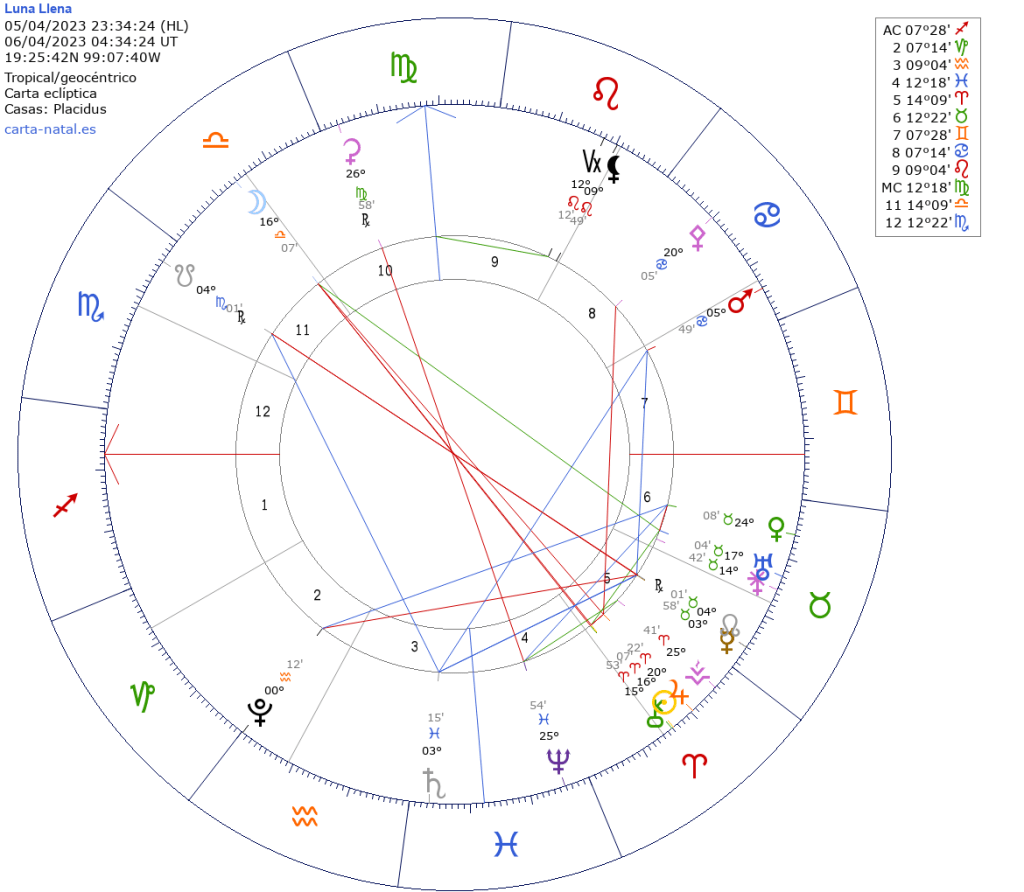 Será el 05 de abril a las 23:34 hrs. tiempo del centro de México. Sol en Aries y Luna en Libra, ambos en grado 16º07‘. Este es el clímax del ciclo que inició hace seis meses, cerca de la Luna Nueva en Libra 2022 del 25 de septiembre.