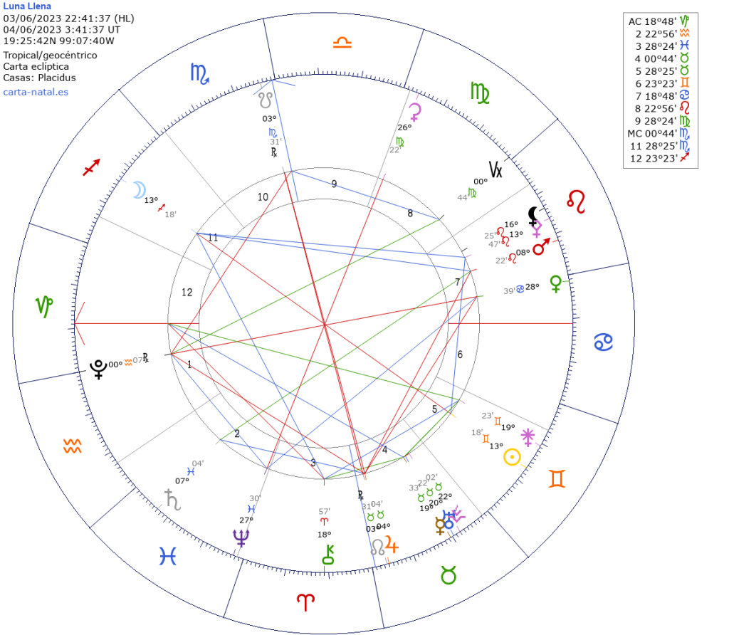 Será el 03 de junio a las 21:41 hrs. tiempo del centro de México. Sol en Géminis y Luna en Sagitario, ambos en grado 13º18′. Representa el clímax de un ciclo que comenzó hace seis meses, cerca de la Luna Nueva en Sagitario 2022 del 23.11.