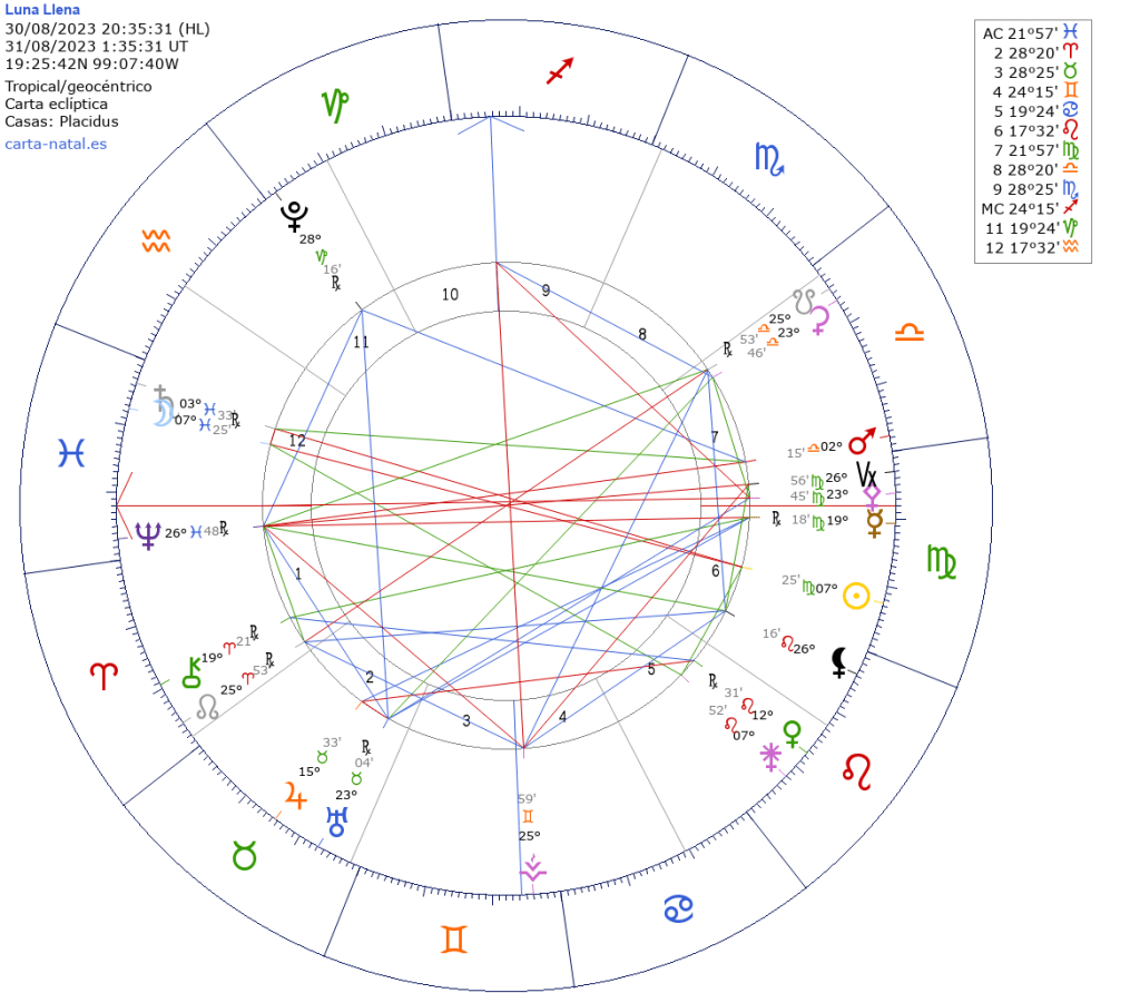 Comparto la carta astral de la Luna Llena y también información por signos que podría leerse según carta astral (por ascendente) o carta solar (por signo), pero sugiero que si se tienen los conocimientos, se revise directamente el 07º25′ de Piscis, porque la casa podría variar.
