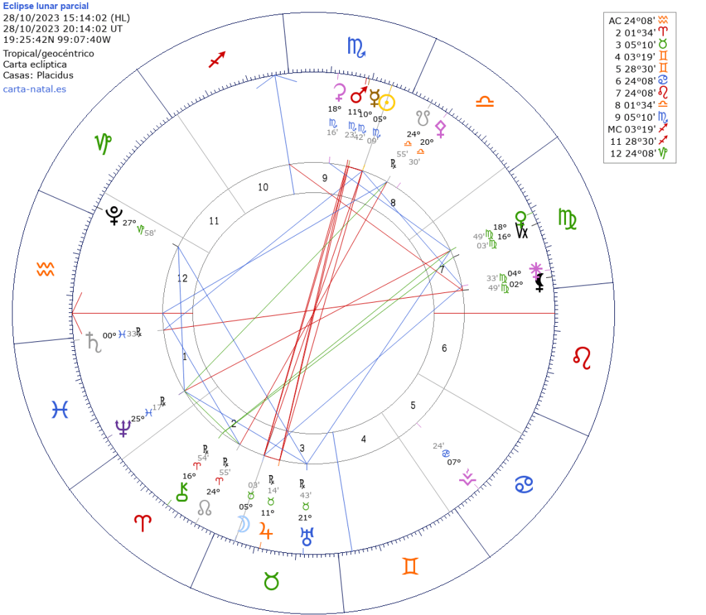 Este eclipse es una cosecha, culminación o clímax, un punto final de los cambios sucedidos de enero 2022 a julio 2023 en temas de autoestima, riqueza o placeres, y dichos frutos están como potenciados por conocimientos o sabiduría ganada en área Taurina (Luna conjunción Júpiter R en Tauro).