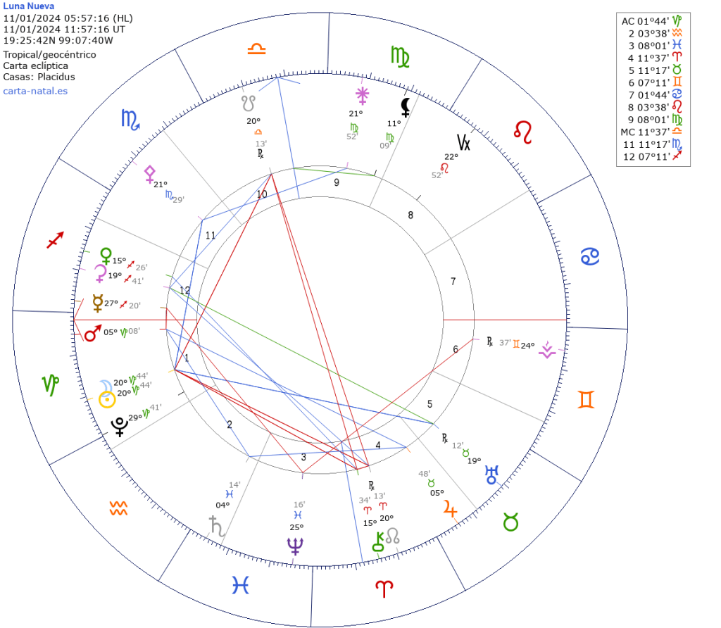 Será el 11 de enero a las 5:57 hrs. tiempo del centro de México. Luna y Sol en el 20º44′ de Capricornio, con influencia del 03.01 al 17.01, y representando el inicio de un ciclo cuyo clímax se verá en seis meses con la Luna Llena en Capricornio del 21.06 en 01º07′ y también con la Luna Llena en Capricornio del 21.07 en 29º09′.