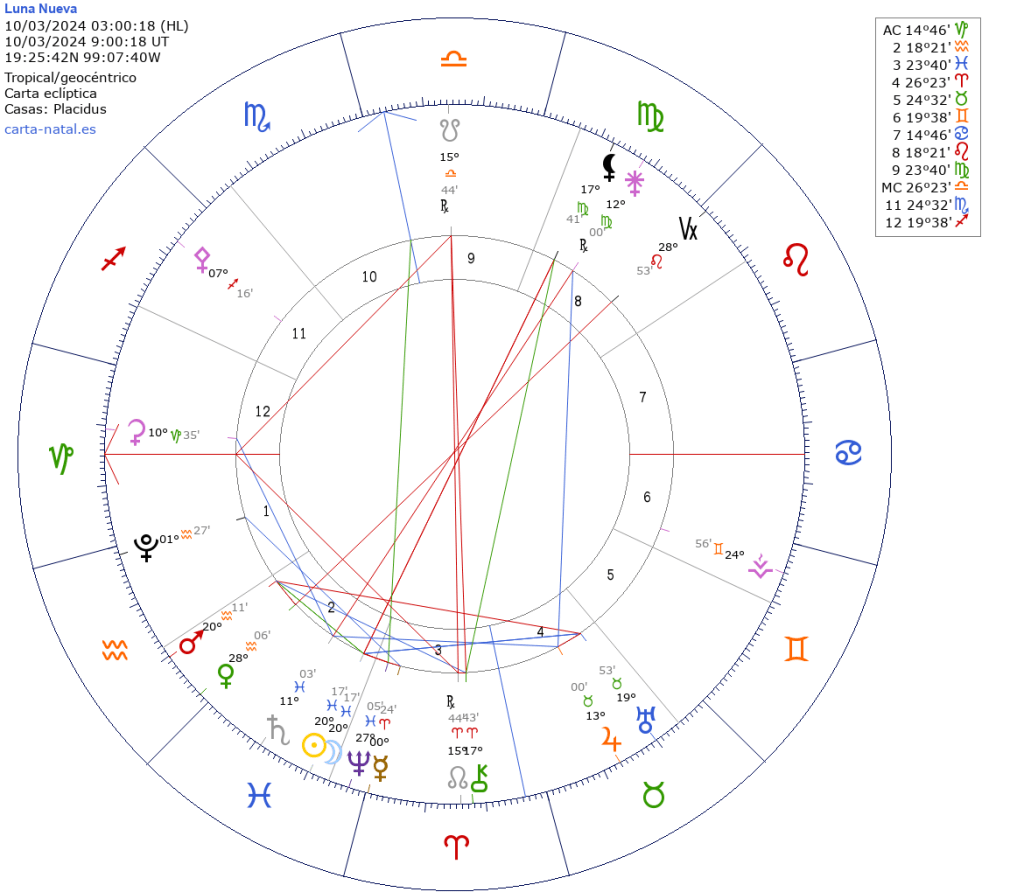 Y también, esta Luna Nueva, da inicio a la primera temporada de eclipses del 2024, en la que tendremos eclipse de Luna Llena en Libra 25.03 -términos-, y de Sol en Aries 08.04 -inicios- (tabla de eclipses en Nodo medio y nodo verdadero, y nodos en Aries y Libra 2023-2025).