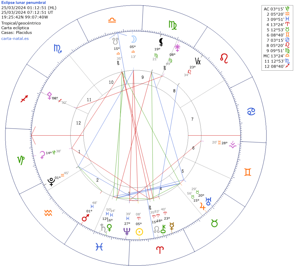 Tengamos presente que cuando el Sol transite por el sitio donde ahora está ocurriendo este eclipse, estaremos en mes Libra 2024, a unos días del último eclipse en Libra 02.10, que será de Sol y representa inicios (aquí tabla de eclipses Aries-Libra).