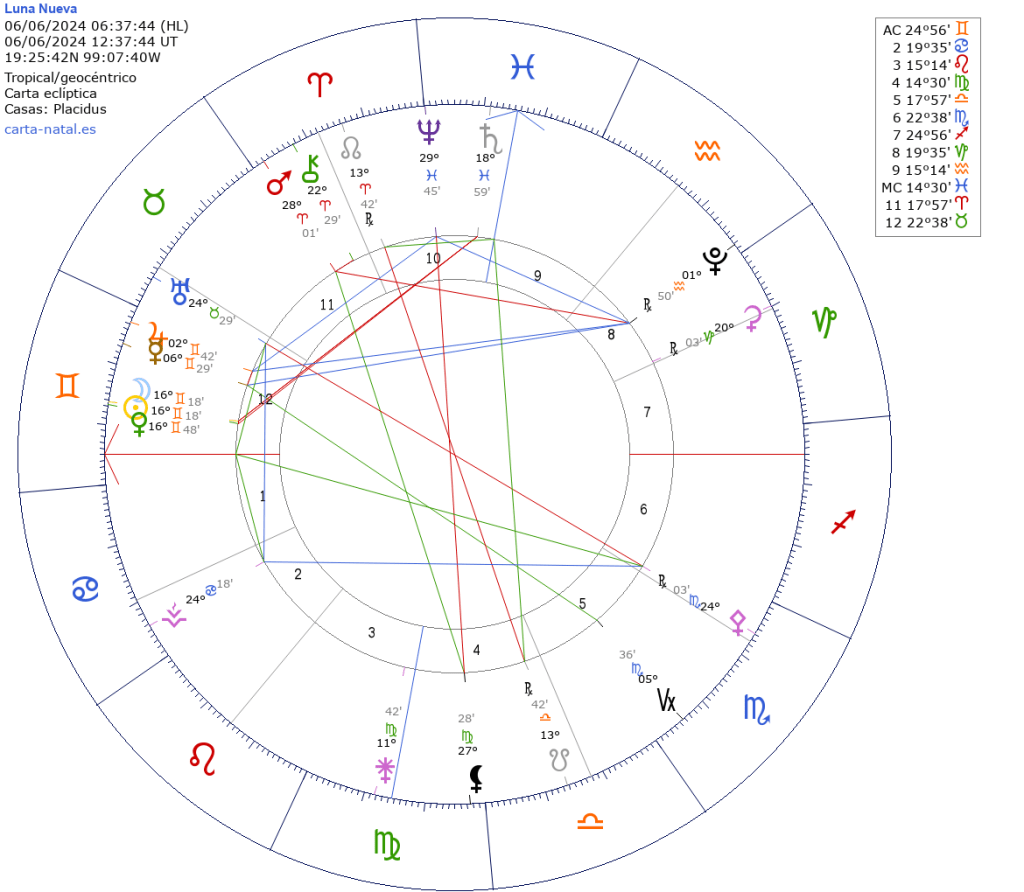 Será el 06 de junio a las 6:37 hrs. tiempo del centro de México. Con influencia del 30.05 al 13.06, y con Luna y Sol en 16º18′ de Géminis. Representa el inicio de un ciclo que tendrá clímax dentro de seis meses cerca de la Luna Llena en Géminis 2024 del 15.12.