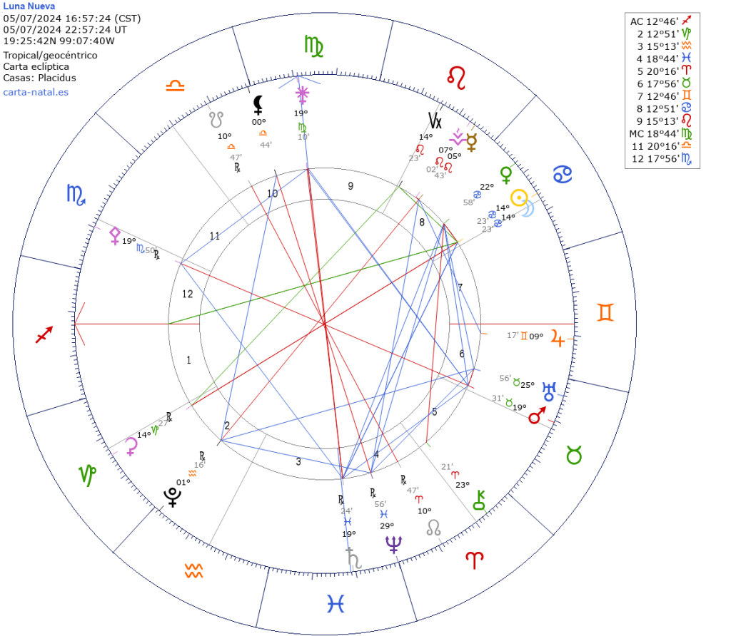 Será el 05 de julio a las 16:57 hrs. tiempo del centro de México. Con Luna y Sol en 14º23′ de Cáncer y con influencia del 28.06 al 13.07. Representa el inicio de un ciclo que tendrá clímax dentro de seis meses cerca de la Luna Llena en Cáncer 2025 del 13.01.