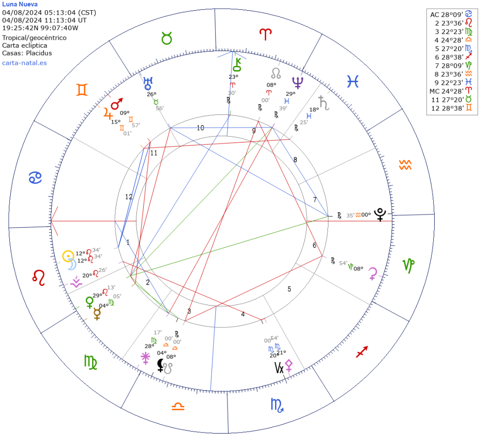 Será el 04 de agosto a las 5:13 hrs. tiempo del centro de México. Con Luna y Sol en 12º34 de Leo, y con influencia del 27.07 al 12.08. Representa el inicio de un ciclo que tendrá clímax dentro de seis meses, cerca de la Luna Llena en Leo 2025 del 12.02.