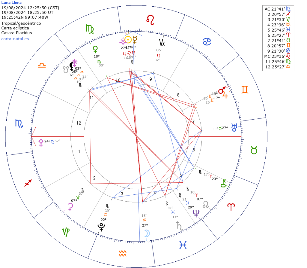 Será el 19 de agosto a las 12:25 hrs. tiempo del centro de México. Con Luna en Leo y Sol en Acuario en 27º15′, y con influencia del 12.08 al 26.08. Representa el clímax de un ciclo que inició cerca de la Luna Nueva en Acuario 2024 del 09.02.