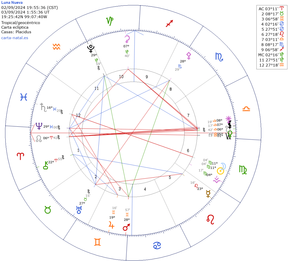 Será el 02 de septiembre a las 19:55 hrs. tiempo del centro de México. Con Luna y Sol en 11º04′ de Virgo, e influencia del 26.08 al 11.09. Representa el inicio de un ciclo que tendrá clímax dentro de seis meses, cerca del Eclipse Total de Luna Llena en Virgo 2025 del 14.03.