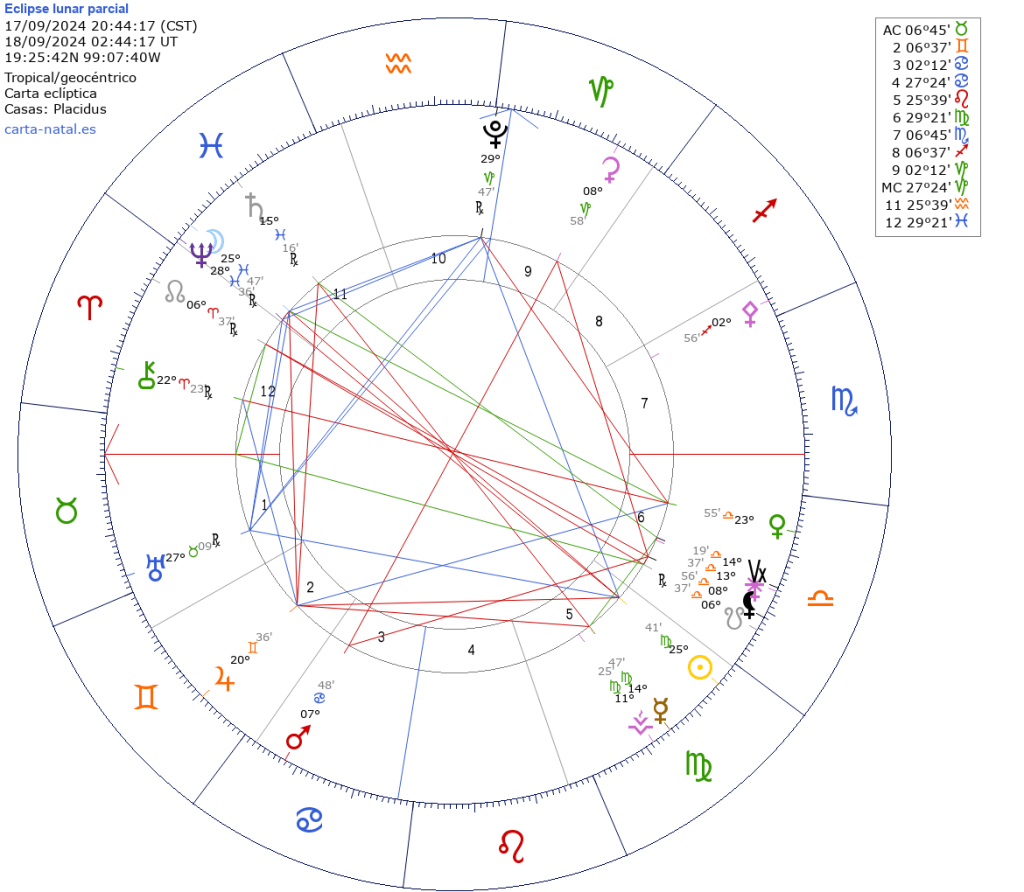 Será el 17 de septiembre a las 20:44 hrs. tiempo del centro de México. Ocurrirá en 25º41′ con Luna en Piscis y Sol en Virgo, y tendrá influencia del 11.09 al 24.09. Representa un clímax predestinado en el área Piscis de nuestra carta astral, del ciclo que inició cerca de la Luna Nueva en Piscis 2024 del 10.03.