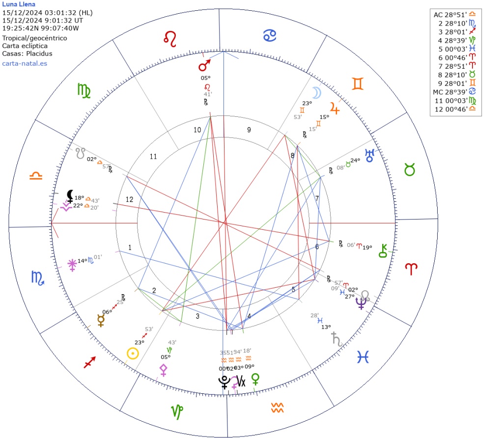 Será el 15 de diciembre a las 03:01 hrs. tiempo del centro de México, con Luna en Géminis y Sol en Sagitario en 23º53′, con influencia del 08.12 al 22.12, representando el clímax de un ciclo que inició hace seis meses cerca de la Luna Nueva en Géminis 2024 del 06.06.