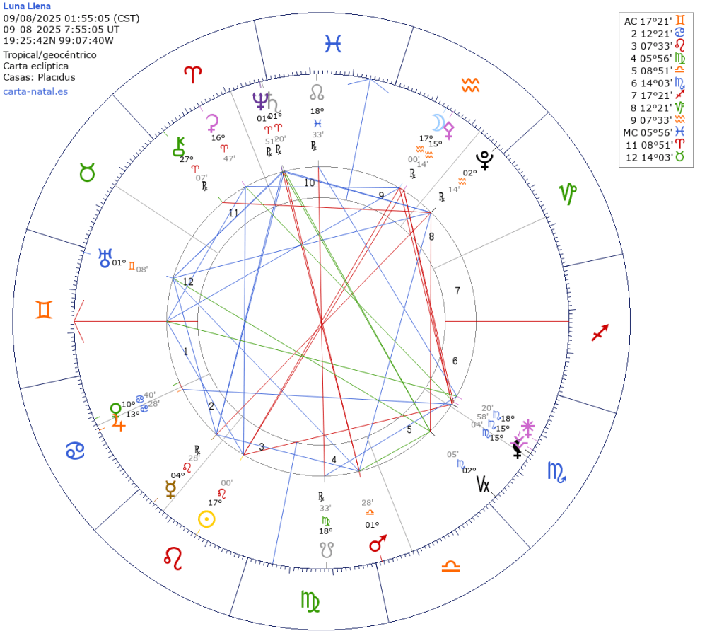 Será el 09 de agosto a las 1:55 hrs. tiempo del centro de México. Con Luna en Acuario y Sol en Leo en 17º00′, e influencia del 01.08 al 15.08. Representa el clímax de un ciclo que inició hace seis meses cerca de la Luna Nueva en Acuario 2025 del 29.01.