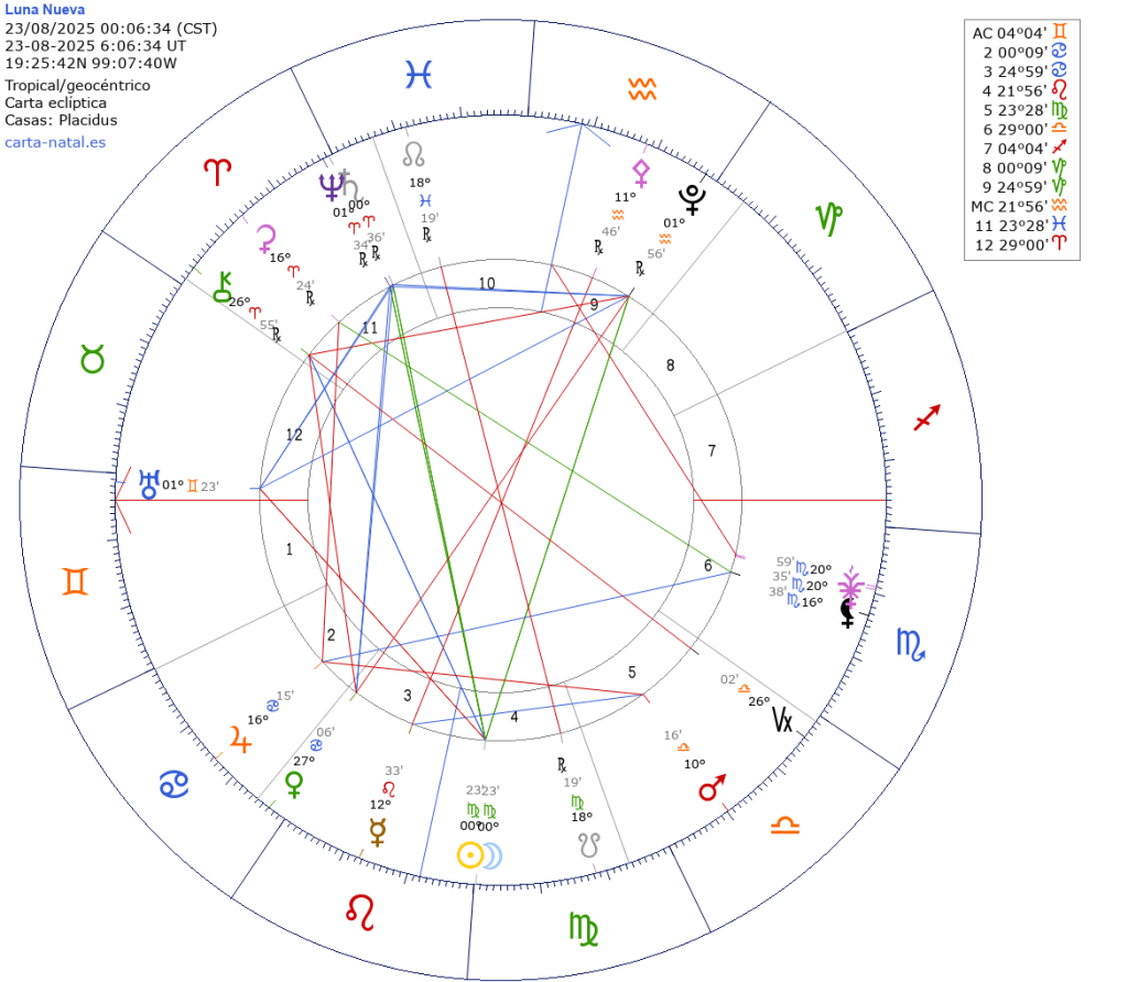 Será el 23 de agosto a las 00:06 hrs. tiempo del centro de México. Con Luna y Sol en 00º23′ de Virgo, e influencia del 15.08 al 31.08. Representa la primera parte de un inicio que tendrá clímax dentro de seis meses, cerca del Eclipse Total de Luna Llena en Virgo 2026 del 03.03.