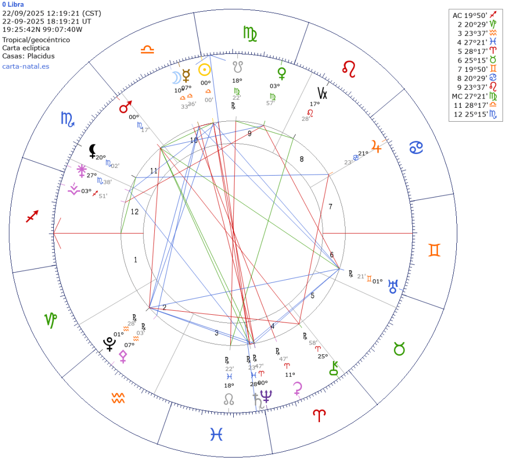 El Sol entró en Libra el 22 de septiembre a las 12:19 hrs. tiempo del centro de México. Con ello recibimos el equinoccio, de otoño para el hemisferio norte, y de primavera para el hemisferio sur, y tenemos que la duración del día y la noche es igual para ambos hemisferios; con el paso de los días, poco a poco, acercándonos al Solsticio con Sol en Capricornio 2025 del 21.12, dentro de tres meses, volveremos a tener una diferencia marcada entre el día y la noche en ambos hemisferios: para el norte, en invierno, serán días más cortos, y para el sur, en verano, días más largos.