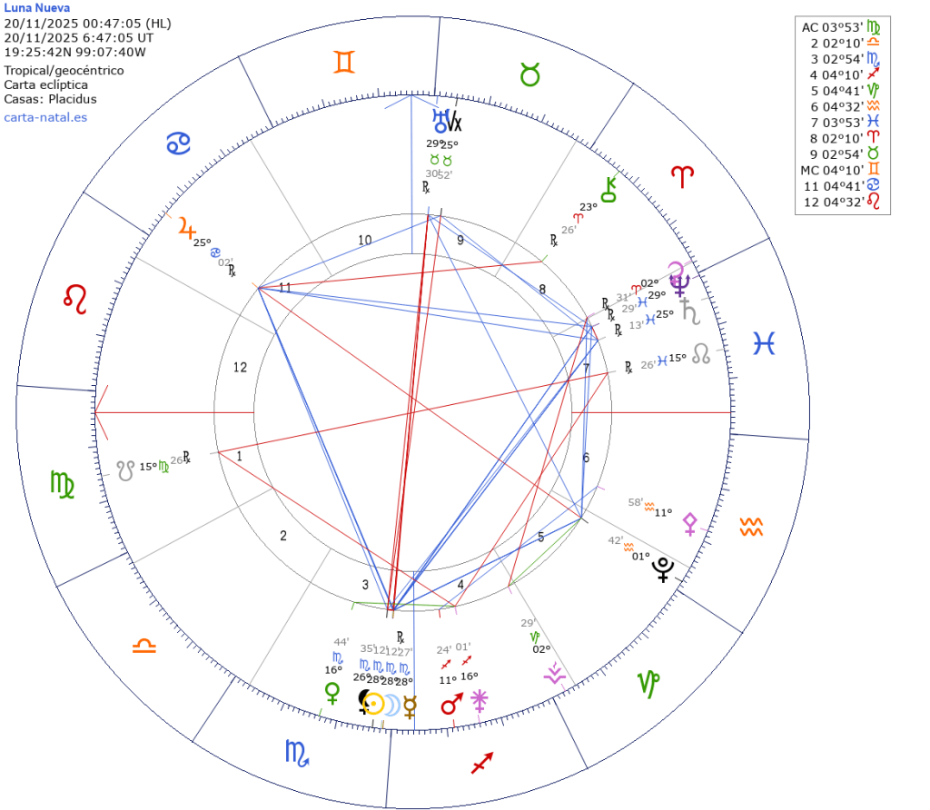 Será el 20 de noviembre a las 00:47 hrs. tiempo del centro de México. Con Luna y Sol en 28º12′ de Escorpio, e influencia del 11.11 al 28.11. Representa el inicio de un ciclo que tendrá clímax dentro de seis meses, cerca de la Luna Llena en Escorpio 2026 del 01.05.