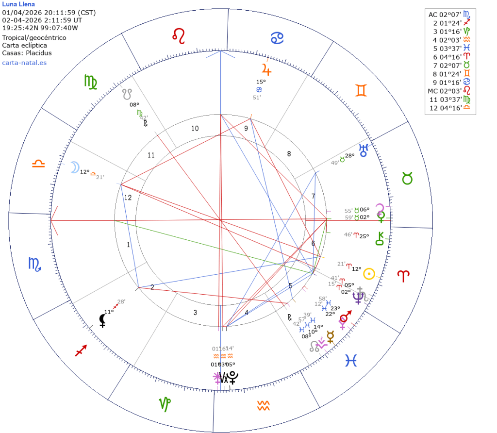 Será el 01 de abril a las 20:11 hrs. tiempo del centro de México. Con Luna en Libra y Sol en Aries en 12º21′, e influencia del 25.03 al 09.03. Representa el clímax de un ciclo que inició hace seis meses cerca de la Luna Nueva en Libra 2025 del 21.10.
