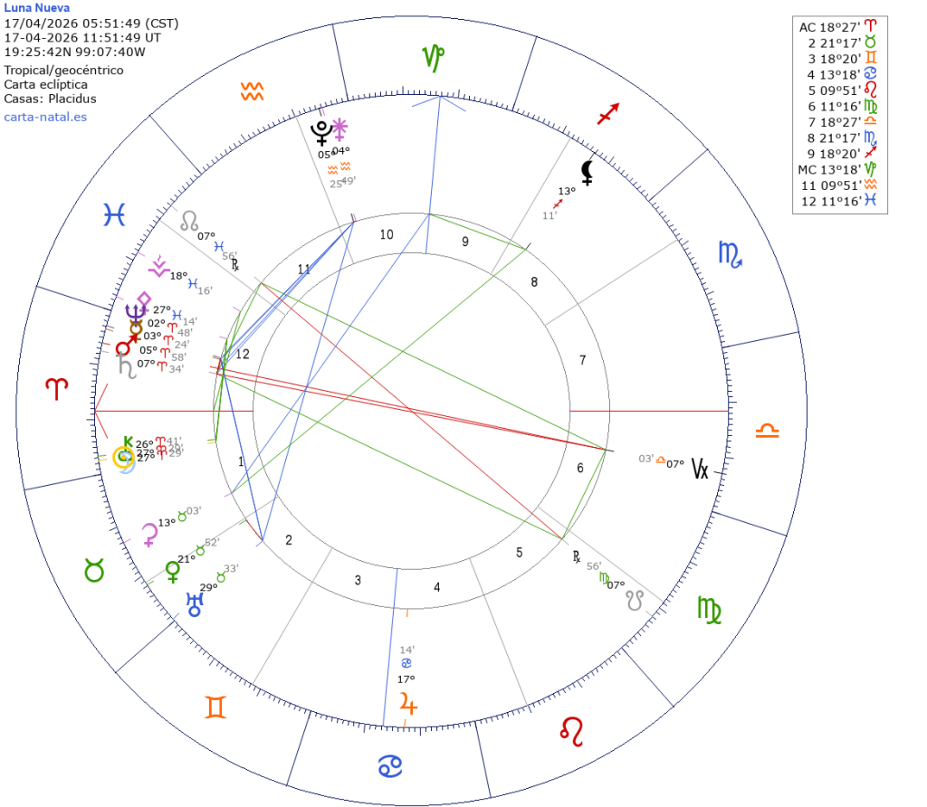 Será el 17 de abril a las 5:51 hrs. tiempo del centro de México. Con Luna y Sol en 27º29′ de Aries, con influencia del 09.04 al 23.04. Representa el inicio de un ciclo que tendrá clímax dentro de seis meses, cerca de la Luna Llena en Aries 2026 del 26.09.